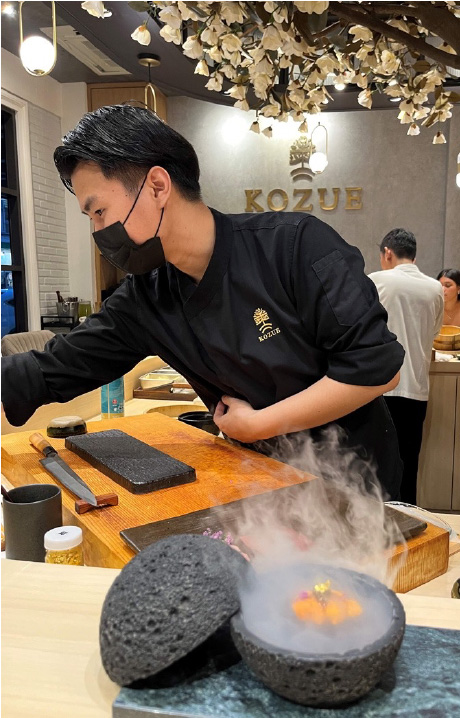 Kozue Omakaseはバンコク市内に4店舗を展開する人気店。Instagramに25,000人のフォロワーがいる。ショッピングモールや有名国立大学に近いSamyan店は、入口にバラのアーチ、店内には木蓮が満開だった。タイ人だけでなく、欧米人や中国人など観光客の来店も多い。